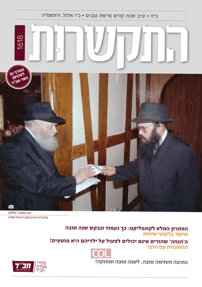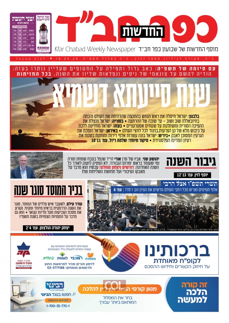 יודעי תרועה: המשפיע הרב דוד אופן מגולל את עבודת הקודש של הרבי ביום הדין | המשך תרס"ו - 120 שנה: הצצה ראשונה לכולל הנדיר, בו מעמיקים אברכים מידי שבוע ב'המשך' | טעם ודעת למדני: סיפורו המפתיע של הרב אפרים זלמן פוטאש מלונדון שזכה לקירובים מיוחדים מהרבי | סודו של אבא: השליח הראשי החדש לפלורידה, הרב בן ציון קארף, בשיחה ראשונה ורוויית גילויים על אביו שהלך השנה לעולמו | במחיצת הרבי: סיפורים ויומנים מראש השנה עם הרבי | בשופר גדול: פרויקט עולמי - שלוחים משתפים בסיפורים מרגשים ממבצע שופר | תשפ"ה שהייתה: סופרי 'כפר חב"ד' בוחרים רגע מהשנה החולפת | במוסף החדשות: זוויות שונות לסיכום השנה | במוסף 'נשימה': שליחת הרבי לקהילת החירשים, בראיון ראשון ומרגש | מצורף: המדריך החב"די ההלכתי לחגי תשרי