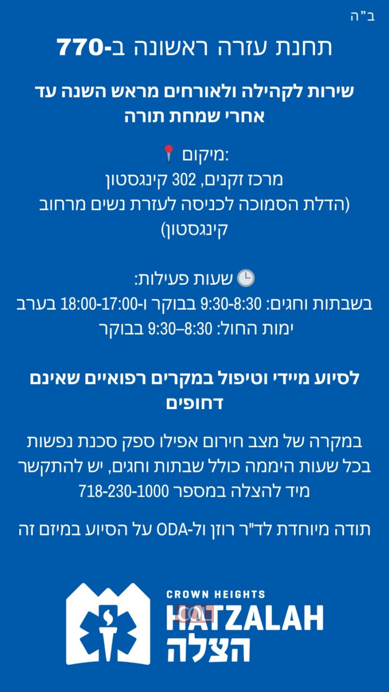 מתוך אהבת ישראל ורצון תמידי לשפר את הטיפול הרפואי בקרב תושבי שכונת קראון הייטס ואורחיה, "חברת הצלה של קראון הייטס" מקימה תחנת עזרה ראשונה ב-770 כדי לשרת באופן מקצועי יותר את הקהילה ואת האורחים הרבים שהגיעו לבקר בחצר הרבי בחודש תשרי.