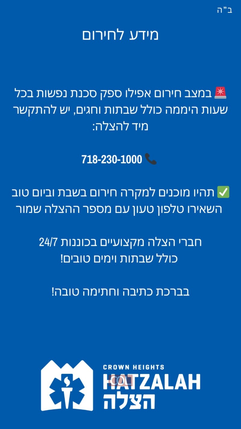 חשוב לזכור כי במקרה של מצב חירום אפילו ספק סכנת נפשות בכל שעות היממה כולל שבתות וחגים, יש להתקשר מיד להצלה במספר 718-230-1000.