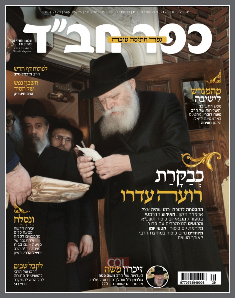 כותרות מגזין כפר חב"ד: כבקרת רועה עדרו - קטעי יומן מיוחדים מיום כיפור במחיצת הרבי לאורך השנים | מהמגרש לישיבה: מסע התשובה והשליחות של הרב משה דוברי - מהטניס בארגנטינה לזאל הישיבה | ונסלח: יצירה חסידית חדשה מציגה כלים מהפכניים לסלוח ולהתגבר על פגיעה, גם בבית | זיכרון משה: העדויות של הרב משה פסח גולדמן ז"ל, שהלך לעולמו, משנותיו הראשונות ב-770 | לקבל שבים: דרכו של הרבי להושיט יד פתוח לכל הבא להתקרב | צפו בשערים