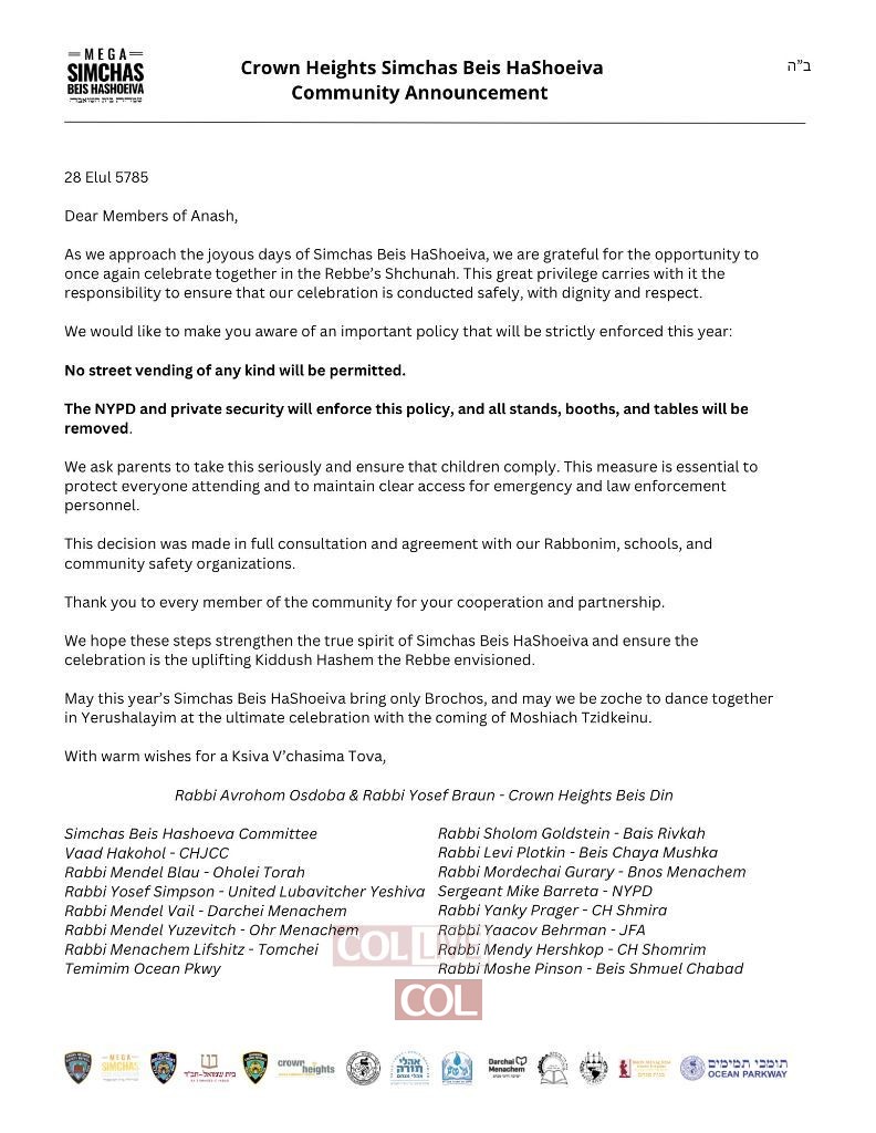 ההודעה, שגובתה גם על-ידי רבני השכונה, ועד הקהילה (CHJCC), מוסדות החינוך המקומיים וארגוני הביטחון, קובעת כי ייאסר לחלוטין להציב דוכני מכירה מכל סוג שהוא לאורך רחוב קינגסטון, בו נערכים ריקודי החג ההמוניים.