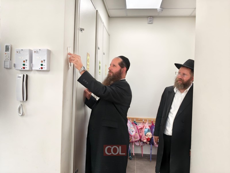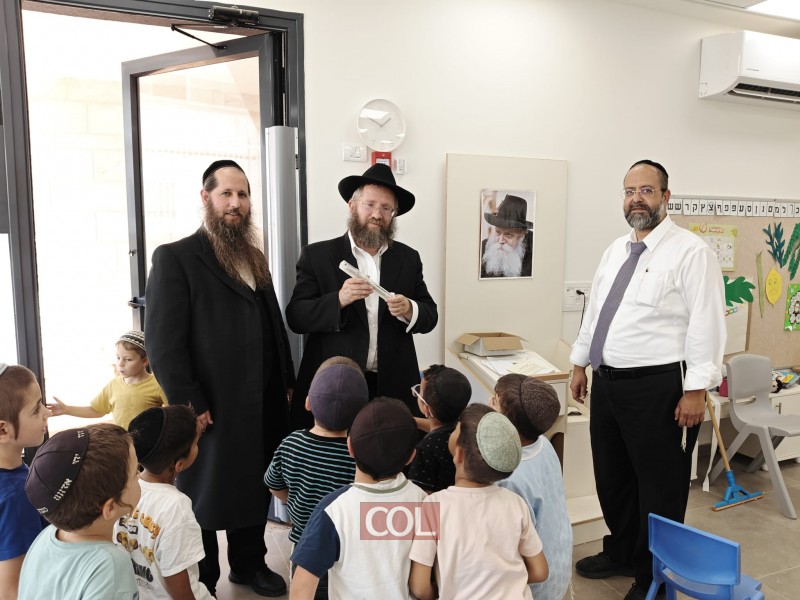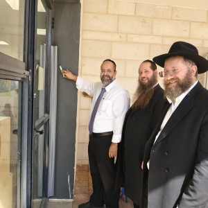 רב קהילת חב"ד בעמנואל וחבר בי"ד רבני חב"ד הרב חיים קיזנ'ר לצד ראש מועצת עמנואל ידיד חב"ד הרב אליהו גפני ומנהל מחלקת חינוך הרב משה חזקיה בקביעת מזוזה של גני הילדים החדשים והמפוארים ביישוב
