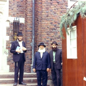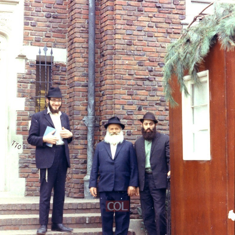 החיוכים אומרים הכל: ר' שאול רסקין ע"ה, בחצר בית חיינו 770 ליד הסוכה של הרבי, לפני כחמישים שנה במהלך חג הסוכות, ליד אחיינו ר' שלמה מרגולין שיחי', צופה מן הצד ר' יודל בלסופסקי | מתוך ארכיון ר' שמואל ריבקין