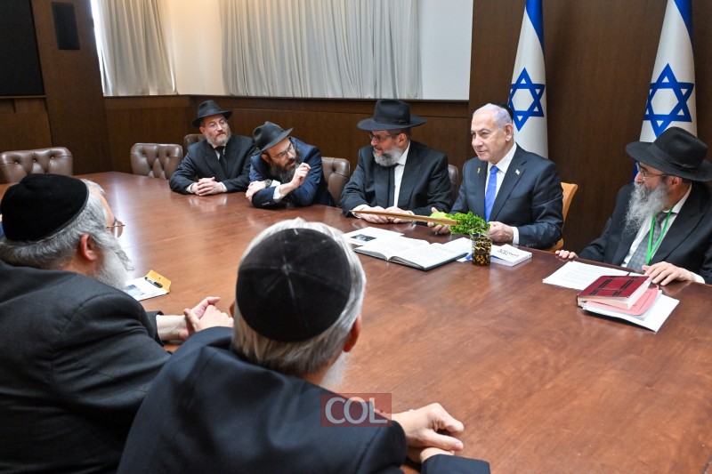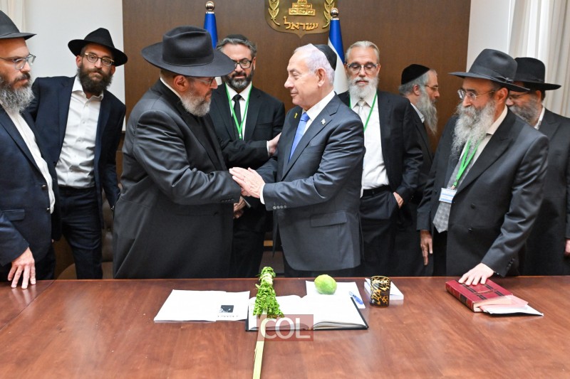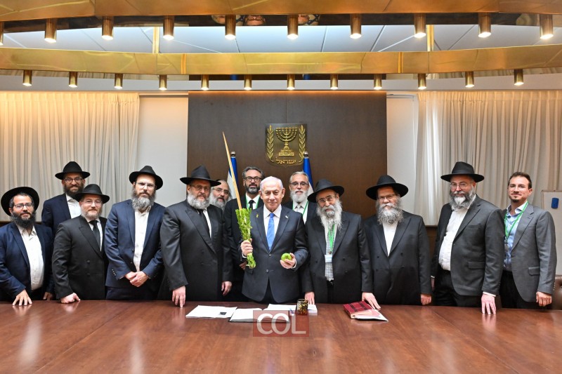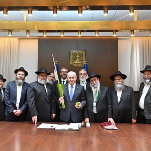 ראש הממשלה בנימין נתניהו אירח בצהריים (שני), ערב חג הסוכות, משלחת רשמית של רבני חב"ד, במהלכה הוענק לו סט מהודר של ארבעת המינים, אתרוג, לולב, הדסים וערבות.