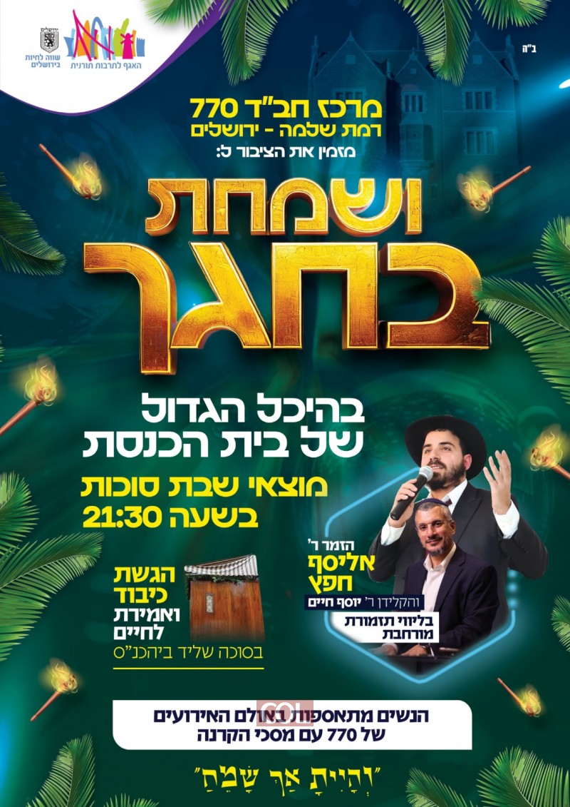 במוצאי שבת הקרוב תתקיים החל מהשעה 21:30, שמחת בית השואבה בהיכל 770 ברמת שלמה בירושלים עם הזמר החסידי אליסף חפץ והקלידן יוסף חיים. כיבוד קל יוגש בסוכה. מקום מיוחד לנשים לצפיה במסכי ענק באירוע.