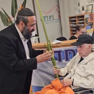 חיים אשכנזי בן 103 בירך השבוע על לולב בהתרגשות רבה בבית רחל ליצק בערוגות עם הרב שבתי וינטרוב מנחלת הר חב"ד | אשכנזי הוא ניצול מהטיל האיראני שהרס בניין בבת ים, ואשתו בלה אשכנזי הי"ד שהייתה בת 90 הי"ד נהרגה. גם הבת ברכה על הלולב לע"נ האמה שנהרגה ולזכות כל המשפחה