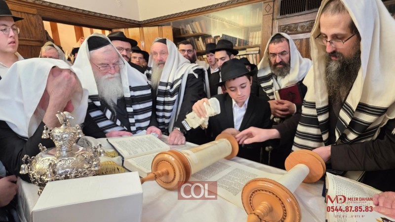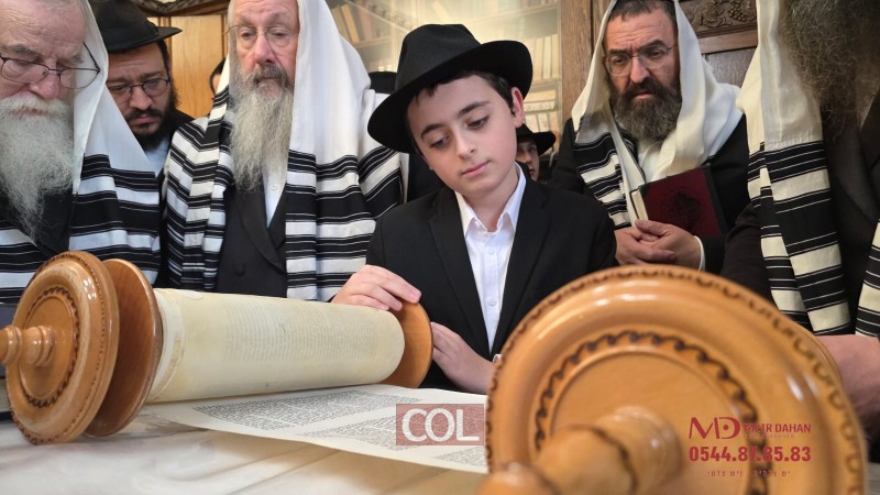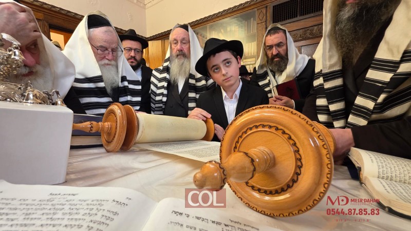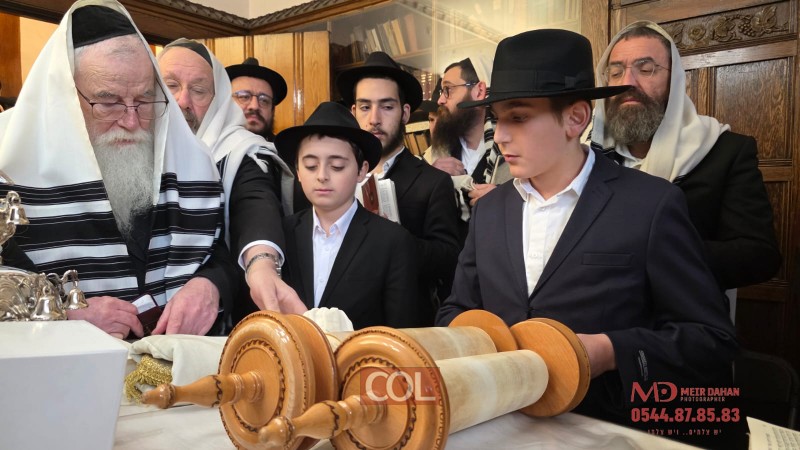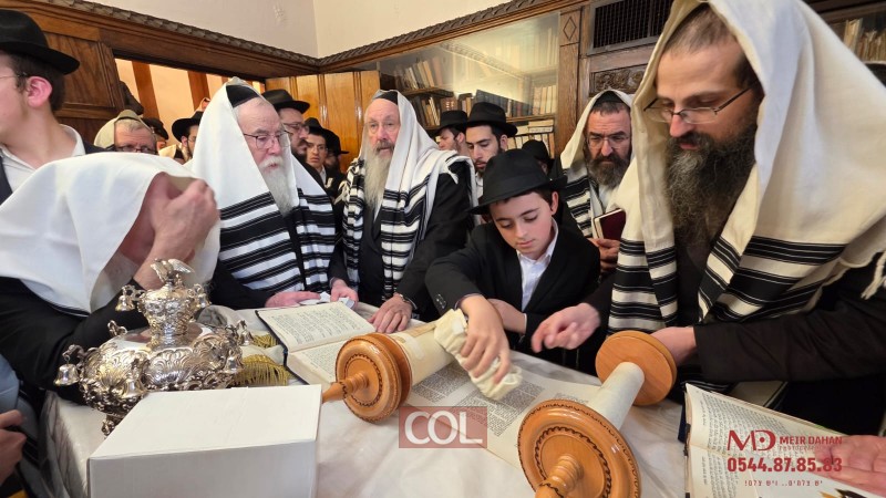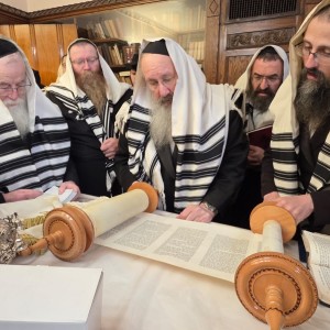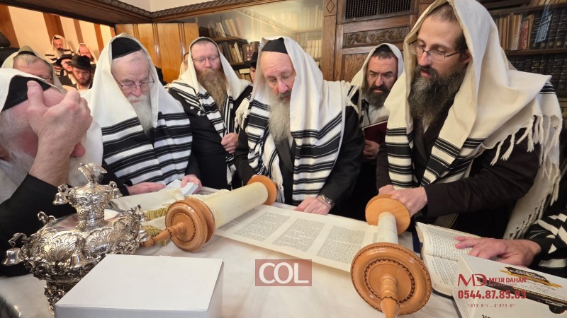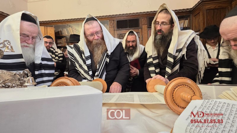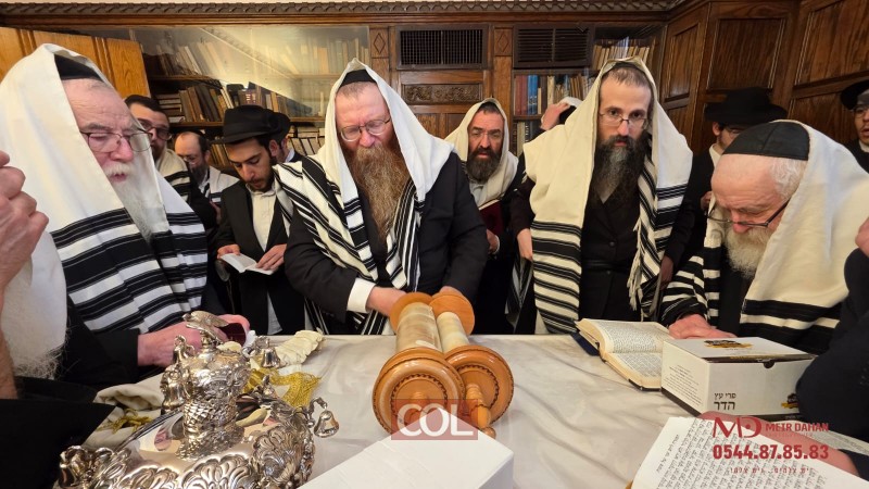 בקריאת התורה במניין בחדרו של הרבי: המשב"ק הרב חיים ברוך הלברשטאם, המשפיע הרב ברוך כהנא, יו"ר כולל חב"ד הרב שלום דוכמן ונציג חב"ד בביתר ר' מאיר ברלב. צילום: מאיר דהן COL