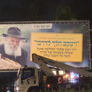 גם בכפר חב"ד מכריזים 'ויעקב הלך לדרכו' במוצאי שבת בראשית: מנוף מטעם ועד מקומי כפר חב"ד מציב שלט ענק בכניסה לכפר