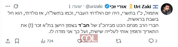 יו"ר הנהלת מרצ אורי זכי שיתף את אלפי עוקביו ברשת החברתית X כי ידידו שליח הרבי בצפון הישן של תל-אביב, הרב מנחם העכט, הזמינו לרגל יום-הולדתו לעלות לתורה בשבת בבית הכנסת - והוא נענה