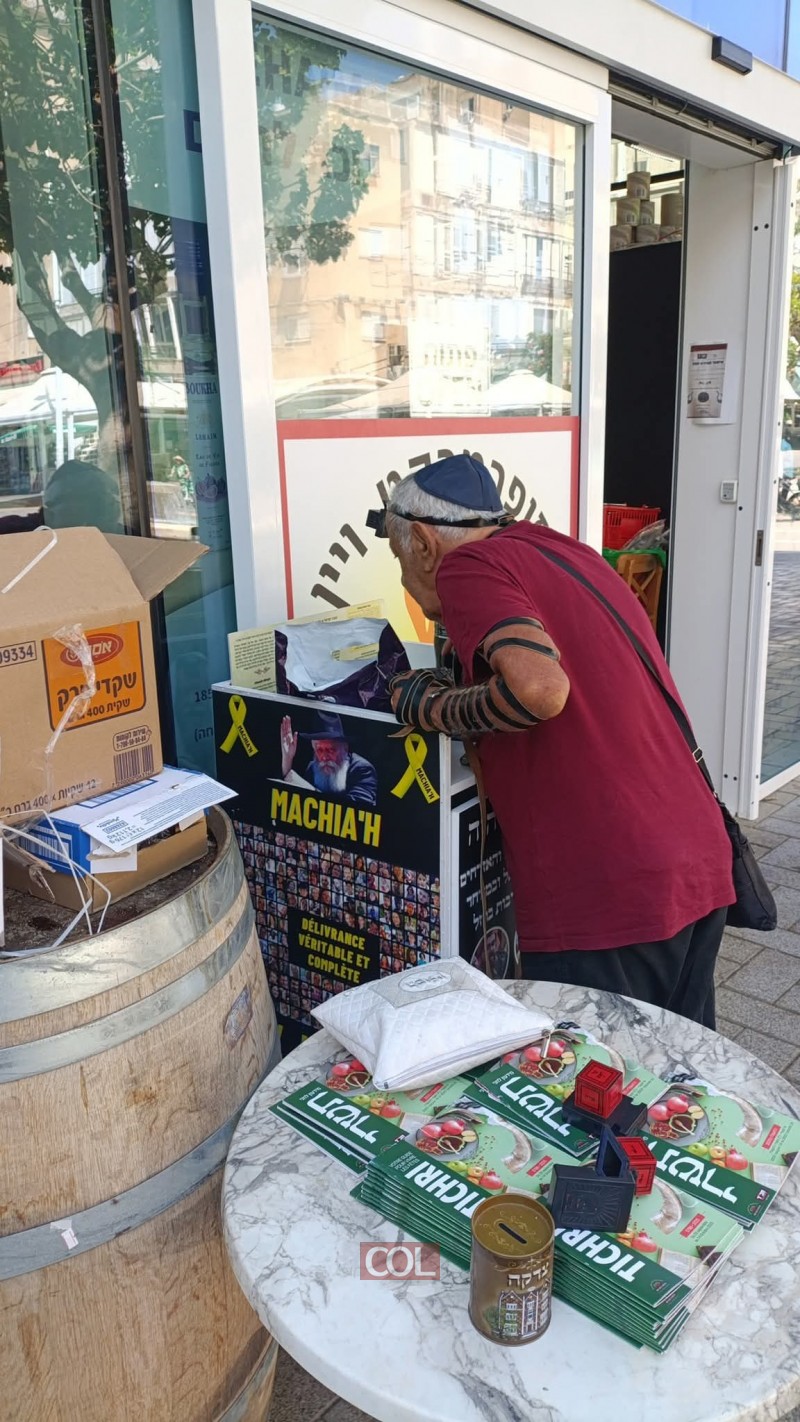 דוכן התפילין שהוקם בכיכר בנתניה לפני 11 שנה ופועל מאז ללא הרף ע"י הרב מנחם לאלום תחת השליח לדוברי צרפתית - הרב יעקב מאזוז מציין חצי מיליון הנחות תפילין וזיכוי הרבים במצווה החשובה