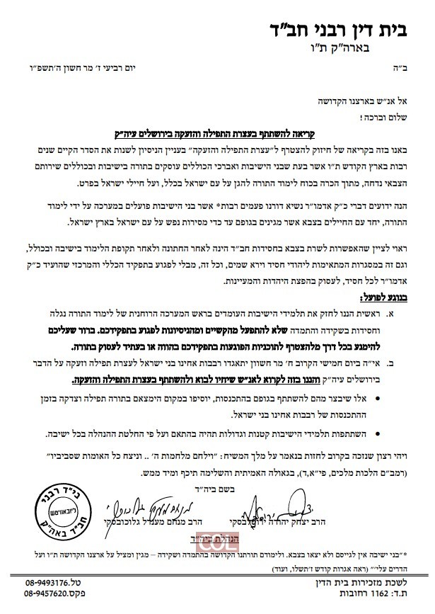 רבני בית דין רבני חב"ד בארץ הקודש קוראים לציבור אנ"ש להשתתף בעצרת התפילה והזעקה מחר בירושלים, בעקבות גיוס ומעצר בני הישיבות השוקדים על לימוד התורה.