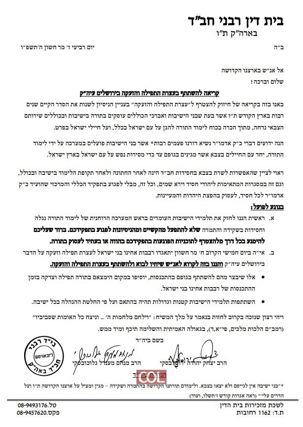 כפי שפורסם ב-COL, בקריאה ציבורית שפורסמה על-ידי בית דין רבני חב"ד בארה"ק, נקרא ציבור אנ״ש להשתתף בעצרת. לגבי הישיבות, כל ישיבה תקבל החלטה האם להוציא את הבחורים מסדרי הישיבה כדי להשתתף או לערוך אמירת תהילים במסגרת כותלי הישיבה.