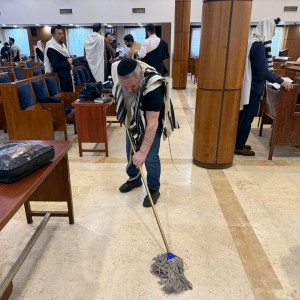 מורא מקדש: מנהל התחזוקה בבית הכנסת המרכזי במוסקבה - ר' מוישה דוקרביץ, מתמסר בעצמו לנקות כתמי קפה על רצפת בית הכנסת (צילום: שייע בטוויטר)