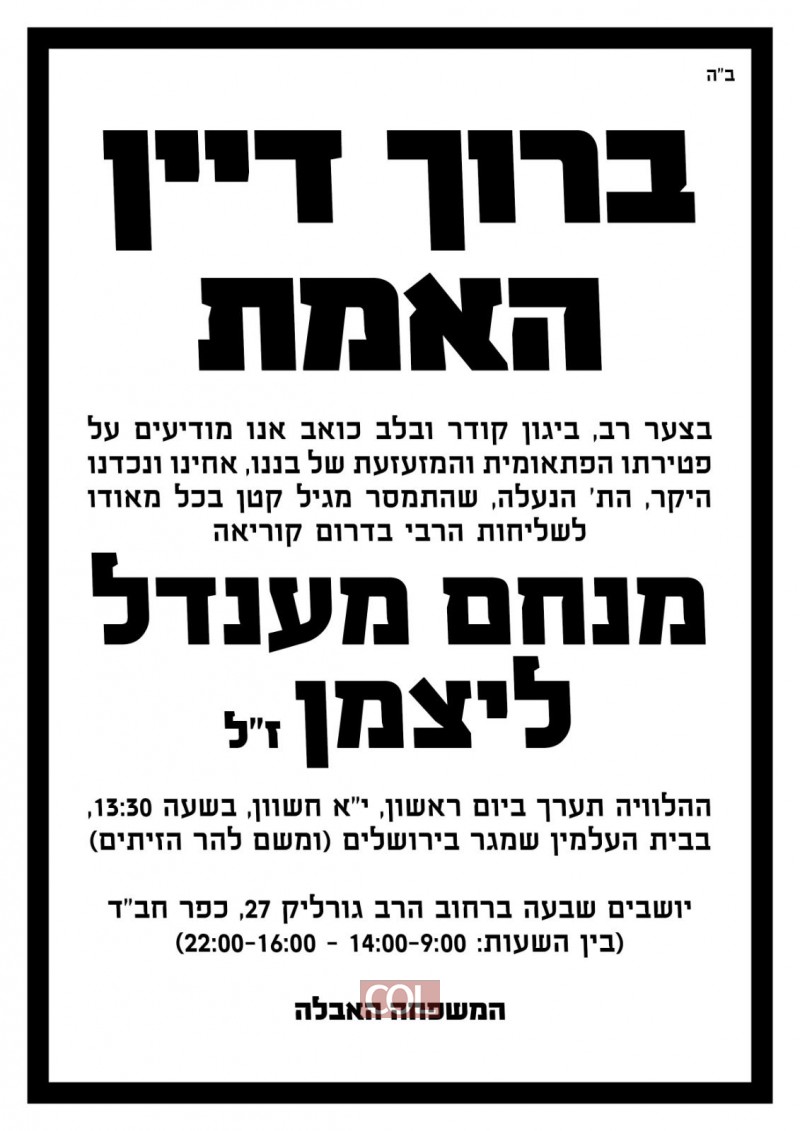 ביום ראשון י"א חשוון תתקיים הלוויית הת' מנחם מענדל ליצמן ז"ל, שנהרג בנסיבות טרגיות אמש, במהלך עצרת התפילה בירושלים.