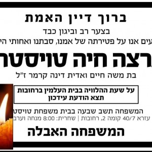 בצער רב התקבלה הידיעה על פטירתה של גב' תרצה חיה טויסטר ע"ה, אמו של המוזיקאי החב"די ר' דורון טויסטר