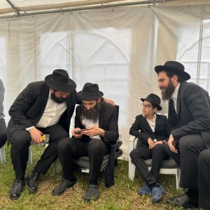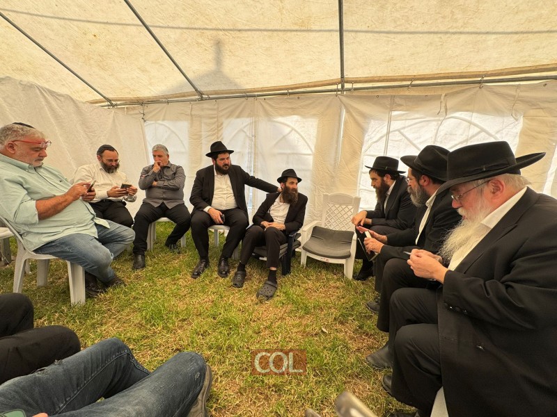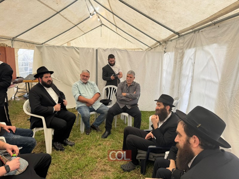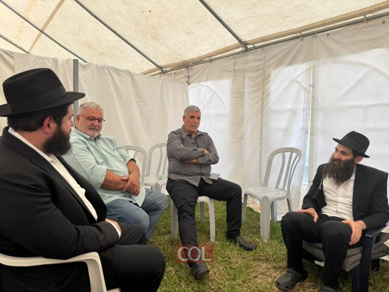 הרב מענדי קוטלרסקי מה'מרכז לענייני חינוך', השליח הרב מנחם הרטמן מויטנאם, ראש העיר קרית מלאכי ללו זוהר וידידים נוספים בניחום אבלים אצל השליח לקוריאה הרב אשר ליצמן, היושב 'שבעה' על בנו
