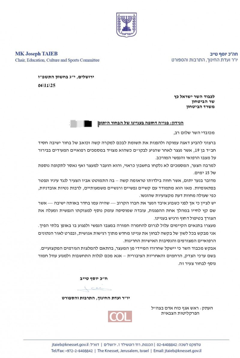 בעקבות הפרסום אתמול כאן ב-COL וחשיפת הכתב הצבאי מנדי ריזל בפרשיית הבחור החב"די בן ה-19 שנעצר כשהגיע לבקו"ם להציג מסמכים רפואיים המעידים על אי כשירותו - יו"ר ועדת חינוך, ח"כ יוסי טייב מש"ס, שלח "פניה דחופה" לשר הביטחון כץ, לראש אכ"א האלוף בר-כליפא ולפרקליטות הצבאית בנוגע לע', בחור הישיבה שנעצר למרות בעיותיו הנפשיות והחשש לשלומו.