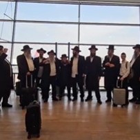 לקראת העלייה למטוס פרצו החסידים בריקוד חסידי סוחף בשדה התעופה, כשהם שרים ורוקדים בשמחה.