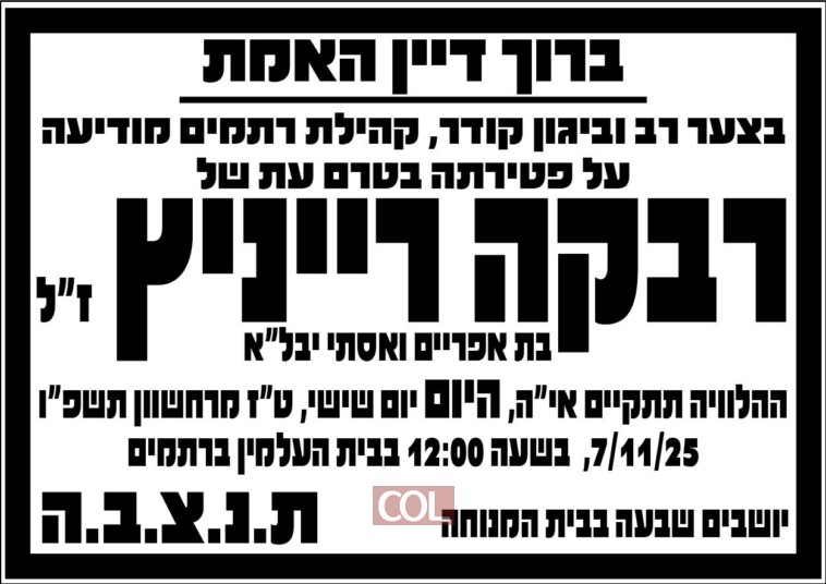 בצער רב מתקבלת הידיעה על פטירתה של החיילת בצבאות השם רבקה רייניץ ע"ה, אחרי מחלה קשה. בת 4 בפטירתה | בתם של השלוחים במושב רתמים הרב אפרים ורעייתו אסתר יבדלו לחיים | ההלוויה התקיימה ביום שישי והמשפחה יושבת "שבעה" בביתם | ברוך דיין האמת