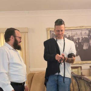 כתב חדשות 12 לענייני חרדים, אלי הירשמן, מניח תפילין יחד עם הרב שמואל אוירכמן מנהל קשרי ממשל מטעם אגודת חסידי חב״ד