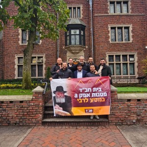 המריאו יחד לכינוס השלוחים: שליח הרבי בשכונת פסגות אפק בראש העיר - הרב שניאור כהן, עם קבוצת מקורבים בחזית 770 שבניו יורק
