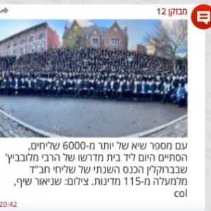 מבזק 'חדשות 12' מדווח בהתפעלות על כינוס השלוחים העולמי שמתקיים בניו יורק, בהשתתפות כ-6,000 שלוחים מרחבי העולם, עם צילום של שניאור שיף, צלם COL