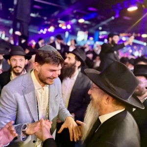 בתום הצגת השלוחים במקומות שליחותם, במעמד ה'ראל קאל' המסורתי, אלפי השלוחים ותומכיהם סיכמו את באנקעט ההצדעה בניו ג'רזי ב'ריקוד הספונטני' עם ספר התורה הכללי ה-11 | מי שהסב תשומת לב מיוחדת היה ניצול השבי סשה טרופנוב, שרקד במעגל יחד עם רבה של רוסיה השליח הגר"ב לאזאר | צילום: הרצל קוסאשוילי, COL