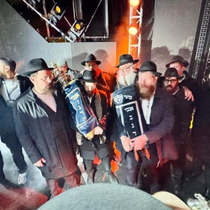 שליח הרבי בקריות - הרב משה שמואל אוירכמן, שעומד מאחורי יוזמת ספר התורה הכללי ה-11 שנכתב בחזית הלחימה, בלבנון ובעזה, לזכות חיילי צה"ל וכוחות הביטחון, יחד עם בניו וחתניו במעמד האדיר בחזית 770