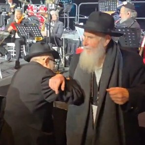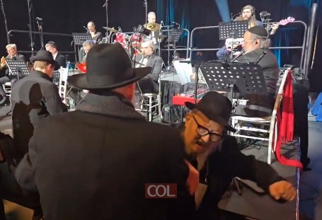 עשרות שנות התמסרות לרבי: השלוחים - הרב שלמה קונין, מחב"ד קליפורניה והרב משה פלר, מחב"ד במינסוטה, בריקוד חסידי בסיום הבאנקעט העולמי