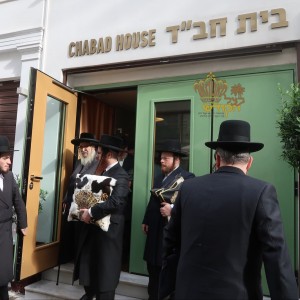 האדמו"ר מסטאמר יוצא מבית חב"ד באתונה שביוון, בניהול שליח הרבי - הרב מענדל הענדל, לאחר תפילת שחרית (צילום: בצל הקודש)