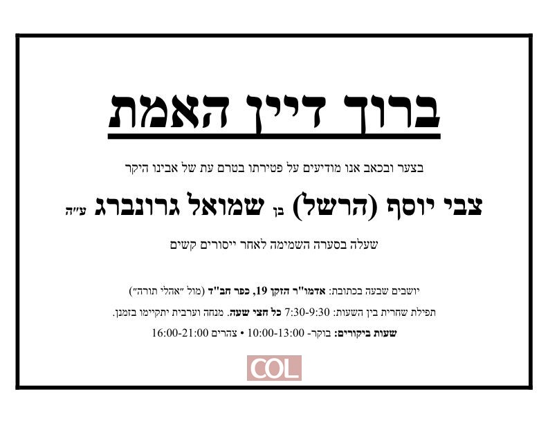 בצער רב מתקבלת הבשורה המרה על פטירתו של הרב צבי יוסף (הרשל) גרונברג ע"ה, מאנ"ש חסידי חב"ד בביתר עילית.