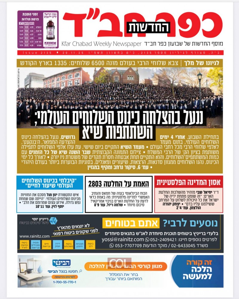 כינוס השלוחים העולמי תשפ"ו: האווירה המיוחדת, הנאומים המרגשים, הפאנלים הפנימיים, הרגעים שלא יישכחו - גיליון מיוחד של "כפר חב"ד" מוקדש לכינוס שלוחי הרבי שנחתם בתחילת השבוע | וגם: הסיפורים שלא פורסמו מהראיון עם הרב ברוך שלום כהן מניו הייבן שנפטר השבוע | במוסף החדשות: ינון מגל משתף בחוויות מהכינוס ופרטים לא ידועים על החלטת האו"ם בגיבוי אמריקאי | צפו בשערים