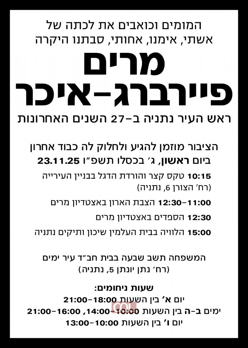 בית חב"ד בשכונת עיר ימים בדרום נתניה הפך למגדלור של יהדות לכל האזור. השבוע תשב במקום "שבעה" משפחתה של ראש העיר נתניה בעשרות השנים האחרונות, הגברת מרים פייברג-איכר, שהלכה לעולמה בסוף השבוע | השלוחים בעיר נפרדו מראש העיר: "הייתה אדם עם לב יהודי גדול ורגיש, שותפה נאמנה לבתי חב"ד בהנחלת ערכי היהדות לכלל אוכלוסיית העיר, בשלל מיזמים. זכויותיה רבות"