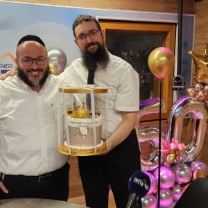 לרגל חגיגות היובל: עורך תכנית הרדיו חידודון ברדיו 'קול ברמה' - ר' שניאור זלמן, הפתיע את שדרן התכנית ר' עמי מיימון בעוגה מיוחדת ובלונים ליום הולדתו ה-50 במזל טוב