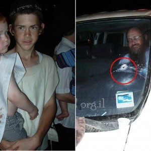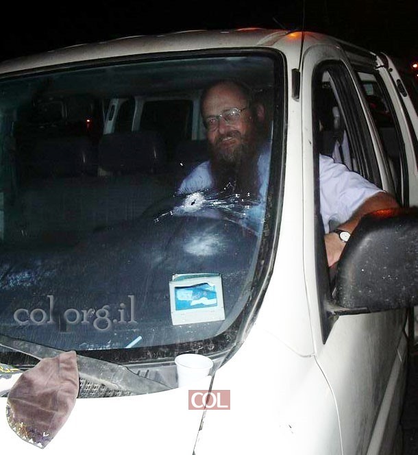 הרב יגאל ברכבו לאחר הפיגוע באותם ימים. הרכב רוסס כולו בכדורים. בעיגול האדום נראה קליע שחדר ממש ממול ר' יגאל ובנס הוא ומשפחתו לא נפגעו. משמאל: שניים מילדיו שניצלו בנס והיו ברכב (ארכיון ר' שמואל ריבקין)