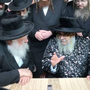 האדמו"ר מסאטמר הנמצא בביקור בארץ הקודש, בפגישה עם רבה של בני ברק הגה"ח הרב יצחק אייזיק לנדא
