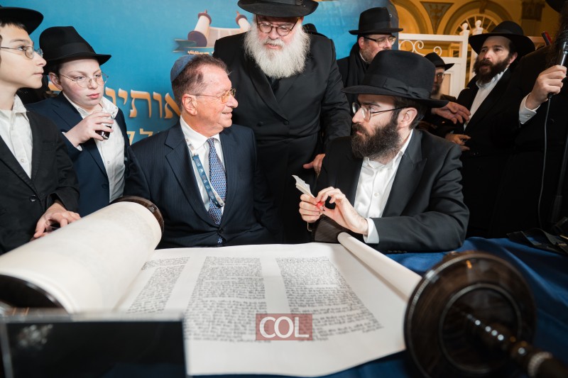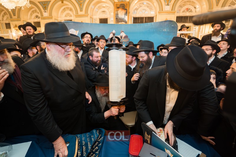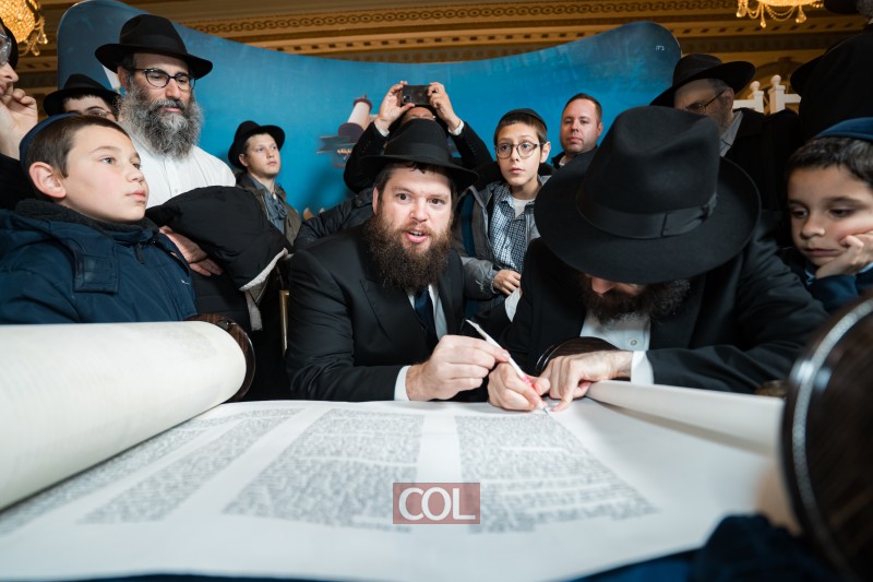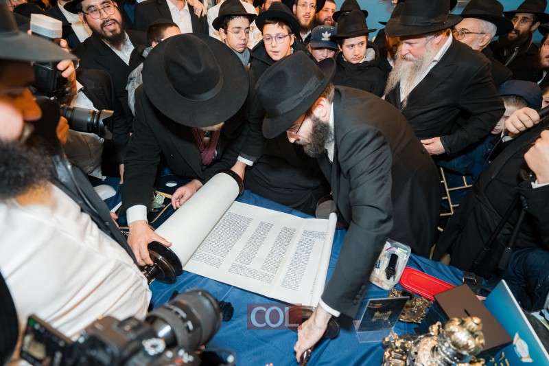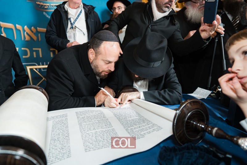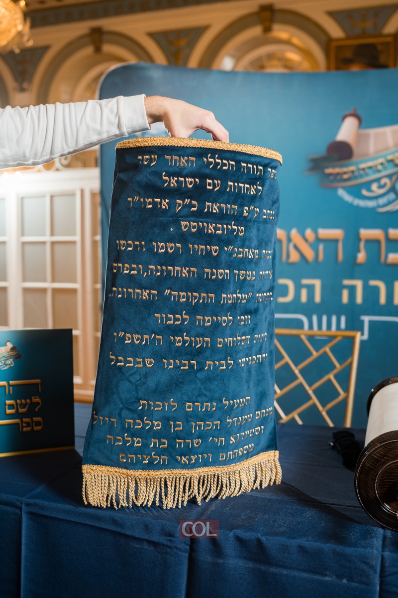 עם סיום הכתיבה כובד הרה"ח הרב יקותיאל פלדמן, מראשי ישיבת תומכי תמימים המרכזית, בהגבהת ספר התורה, הרב מנחם מענדל זלצמן מטורונטו כובד בהנחת הכתר שהוכן לפי ההוראות המדויקות של הרבי למעיל ולכתר.