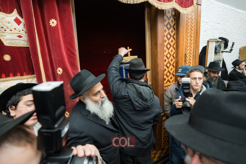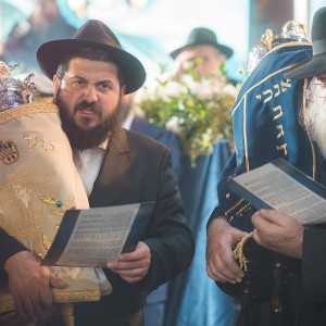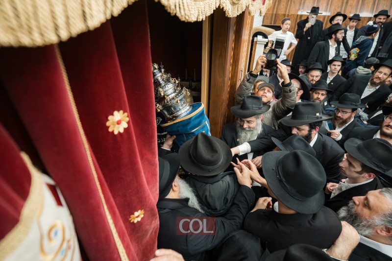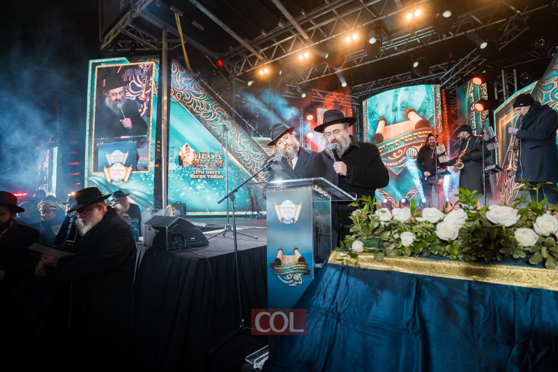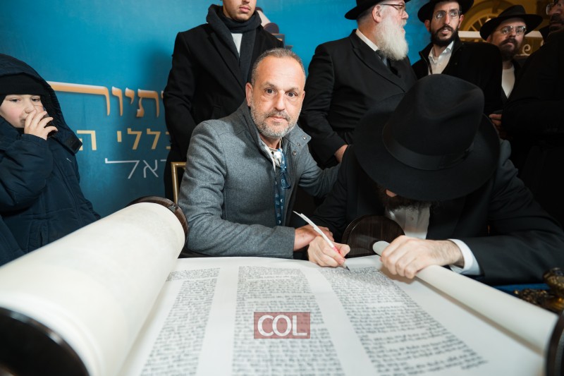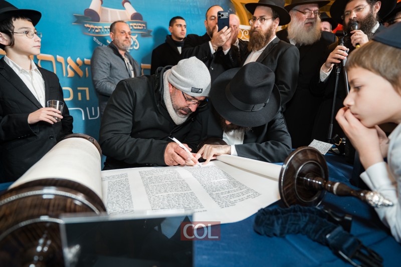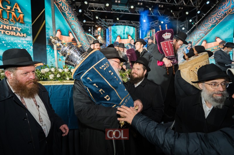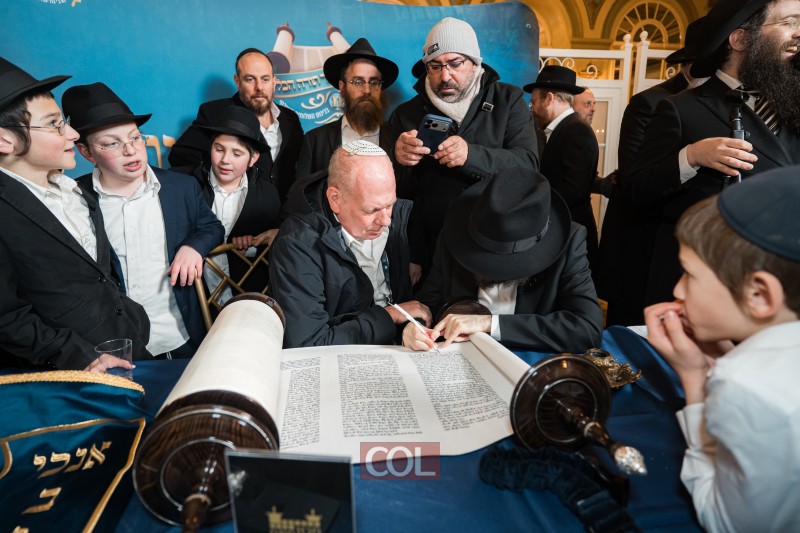 עם סיום הכתיבה כובד הרה"ח הרב יקותיאל פלדמן, מראשי ישיבת תומכי תמימים המרכזית, בהגבהת ספר התורה, הרב מנחם מענדל זלצמן מטורונטו כובד בהנחת הכתר שהוכן לפי ההוראות המדויקות של הרבי למעיל ולכתר.