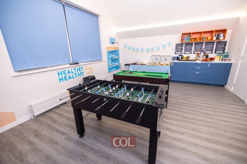 הלאונג’ שוכן בקומה העליונה של בניין “גן ילדים”, שזכה לצמיחה משמעותית בשנים האחרונות, והוא מייצג את השלב הבא בהתפתחות המבנה. מה שהחל כגן ילדים משגשג התרחב למרכז נוער מלא, המשמש כיום בית למגוון רחב של תכניות לילדים ולנוער עבור הקהילה הרחבה.