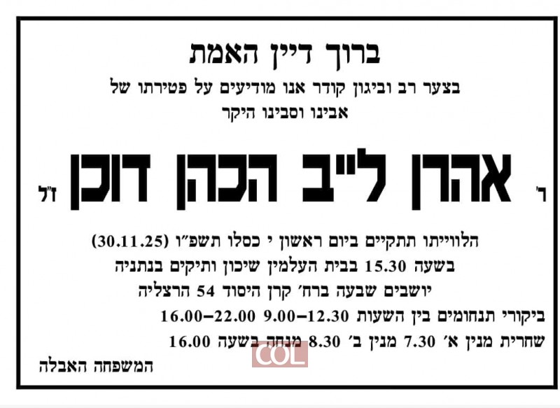 בצער רב מתקבלת הבשורה על פטירתו של הרב אהרן לייב הכהן דוכן ע"ה. נפטר בשבת קודש, ט' כסלו, בישראל, בגיל 77.