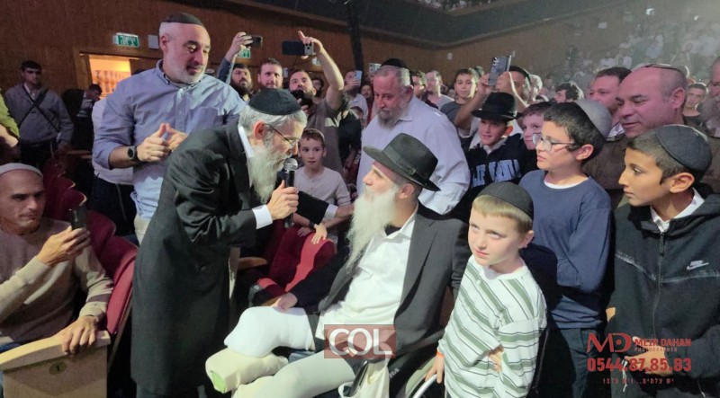 הרב לירז זעירא שנפצע קשה בעת שירותו הצבאי בסוריה ואיבד את שתי רגליו, מספר לזמר אברהם פריד ולקהל הרב: "שכבתי בטיפול נמרץ אבל הבטחתי לילדים שלי שנגיע לאירועי צמאה" | צילום: מאיר דהן, COL