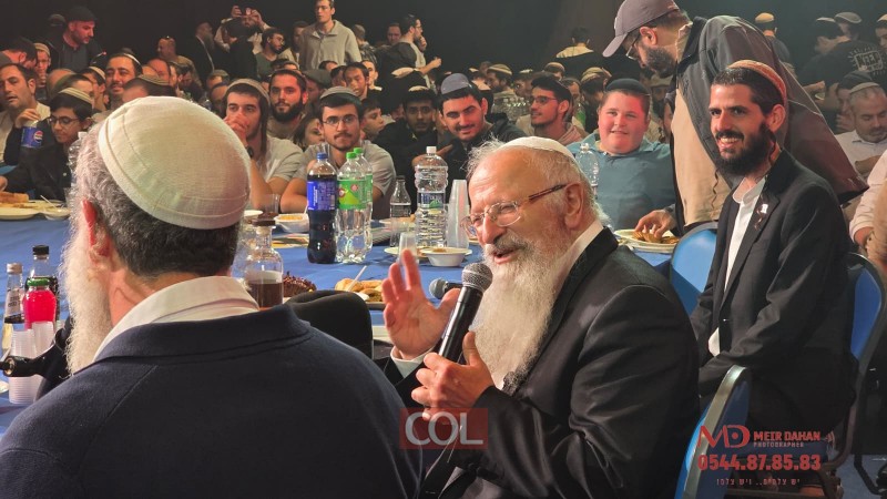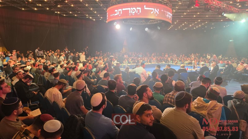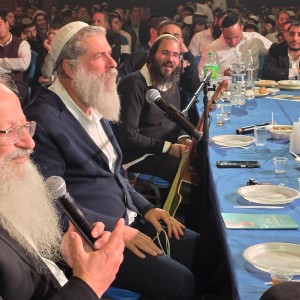 רבה של צפת הרב שמואל אליהו והרב איל יעקובוביץ' רב ישיבת ההסדר בצפת, סוחפים באולם ההתוועדויות בבניני האומה בירושלים במסגרת אירועי 'צמאה' לי"ט כסלו. צילום: מאיר דהן, COL