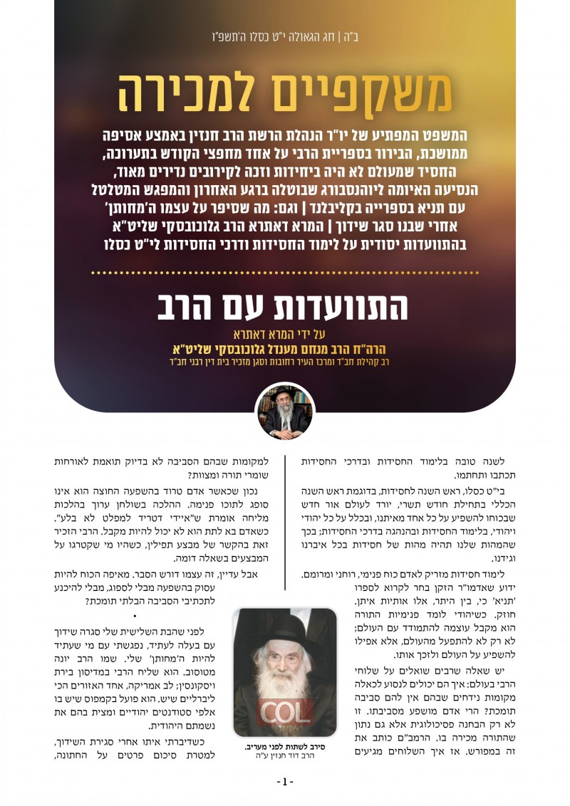למה סירב זקן הרבנים לשתות מים? מה גילה המחותן אחרי שבנו סגר שידוך? איך ספר התניא משפיע על כל יהודי? ומאיפה אפשר להבין מהן דרכי החסידות? | לרגל י"ט כסלו: התוועדות נוספת שכולה חסידות עם המרא דאתרא הרב גלוכובסקי שליט"א | לקריאה