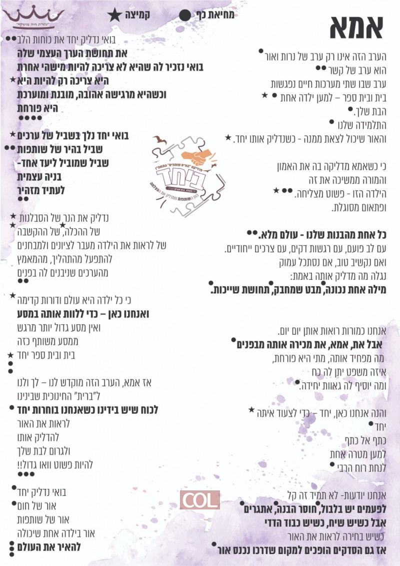 במוסד מציינים כי ערב זה הוא חלק ממהפכה חינוכית רחבה שמתחוללת במוסדות, של שותפות חודשית אמיצה בין ההורים לצוות.