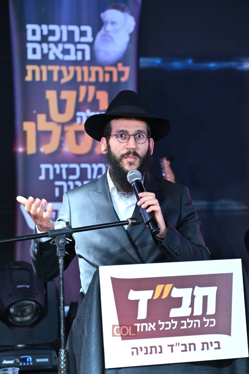 ההתוועדות י''ט כסלו המרכזית של נתניה נחגגה באווירה מיוחדת של רוחניות, שמחה ואחדות שסחפה את כל משתתפיה. במרכז ההתוועדות נאם אורח הכבוד הרב שלום מרדכי רובשקין. פתח את ההתוועדות הרב מנחם ולפא שליח הרבי יו''ר המוסדות ורב קהילת חב"ד נתניה. כן נשא דברים חבר מועצת העיר מר אבי סלמה.