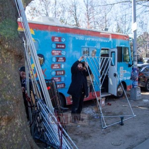 הרב יהודה פעווזנר משלוחי הרבי במנהטן מכין את החנוכייה הגדולה שתוצב על 'טנק המבצעים' שלו במשך שמונת ימי החנוכה ותביא לקידוש השם ופרסום הנס ליהודי ניו יורק (צילום: ליוויק קרומבי)