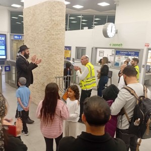 לפרסומי ניסא: הרב פרץ חן משלוחי הרבי באשקלון בהדלקת נר ראשון של חנוכה בתחנת רכבת ישראל בעיר