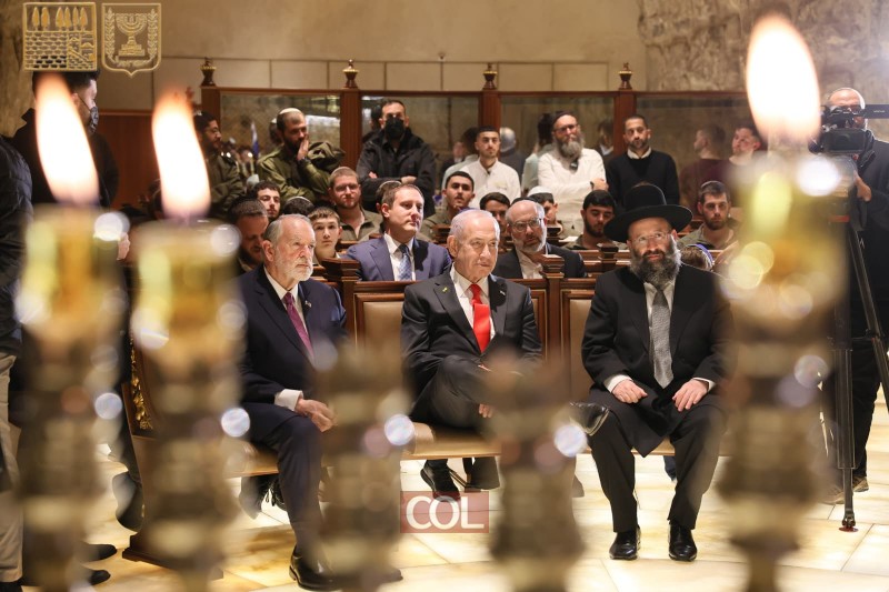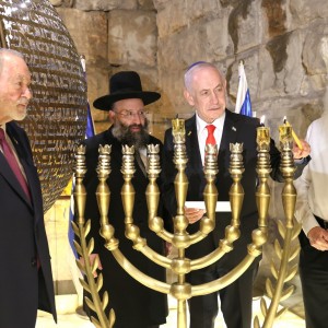 ראש הממשלה בנימין נתניהו ורעייתו שרה יחד עם שגריר ארה"ב בישראל מייק האקבי השתתפו בהדלקת נר שני של חנוכה בכותל המערבי (צילום: הקרן למורשת הכותל המערבי)