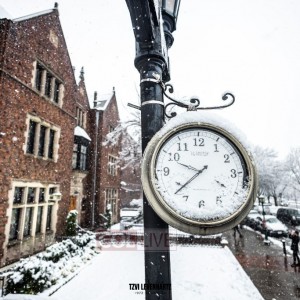 ממשיך לנוע: השעון המפורסם בחזית 770 מכוסה בשלג - אך מראה את השעה המדויקת לאלפי האורחים שהגיעו לחצרות קודשנו לחג החנוכה אצל הרבי (צילום: צבי לבנהרץ)