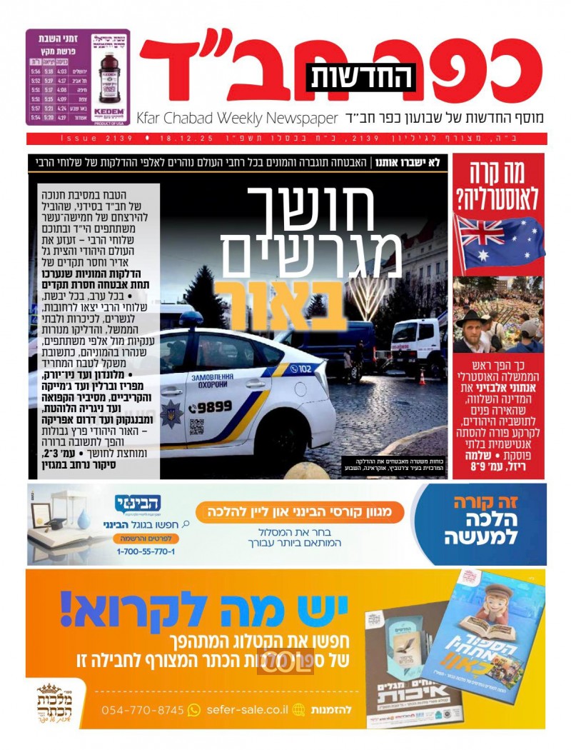 שבועון כפר חב"ד בעקבות הטבח הנורא בסידני, אוסטרליה - סיקור מקיף על הפיגוע המחריד ושיחות רוויות אמונה וביטחון עם שלוחי הרבי והדיין הרב יהורם אולמן - חמיו של השליח הק' הרב אלי שלנגר הי"ד | וגם: הנחמה של הרבי, פעילות השלוחים בעולם בעקבות הפיגוע ו-100 שנים לרד"צ חן | במוסף החדשות: מה קרה לאוסטרליה? | צפו בשערים